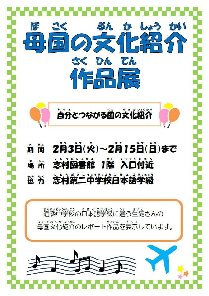 近隣中学校の日本語学級に通う生徒さんの母国文化紹介のレポート作品を展示します。